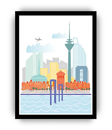JUNOMI® Düsseldorf Poster DIN A2 mit Rahmen Schwarz, DIN A2 Wohnzimmer Deko, Modernes Wandbild, Düsseldorf Bild, Wandbild mit Rahmen, Stadtplan Poster Düsseldorf, perfekte Geschenkidee