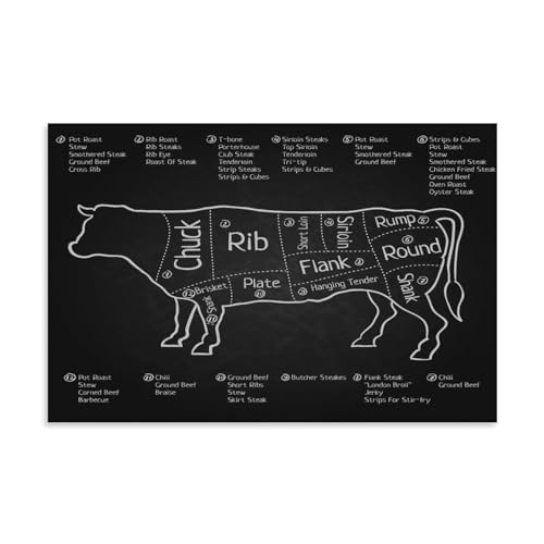 Poster, Motiv: Rinderfleisch, Metzgerführer auf Leinwand, für Lebensmittel, Wandkunst von Rindfleisch, Abteilungstabelle Fleischkunstdrucke, gerahmt, Lebensmittelbild, Gemälde, Größe 40x60 cm