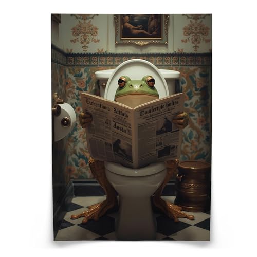 Dazzlewall Komische Frosch Badezimmer Wandkunst, Schwarz-Weiß Whimsical Krone-tragender Froschkönig auf Toilettenpapierhaufen Wanddeko Mit Rahmen 30x40 cm