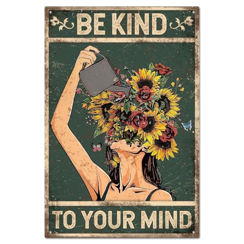 GLOBLELAND Metallschild „Be Kind To Your Mind“ Mit Der Aufschrift „Be Watering Flowers“ 12x8 Zoll Blumenfrau Kunstplakette Poster Wanddekoration Für Küche Bar Club Restaurant Café