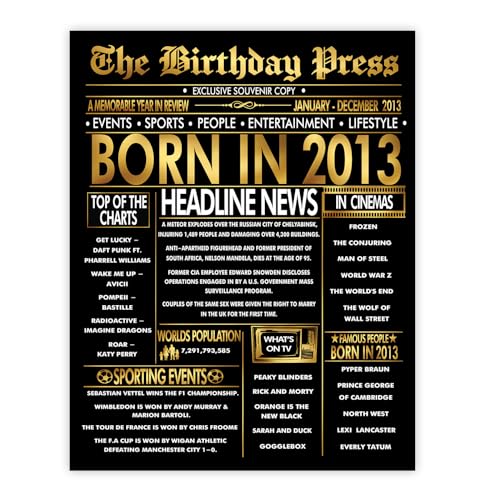 Stuff4 Goldenes Poster zum 12. Geburtstag, ungerahmt – Golden Born in 2013 Zeitung – Happy 12 Birthday für Jungen und Mädchen, Retro-Vintage-Geschenke zurück im Jahr 2013, 20,3 x 25,4 cm
