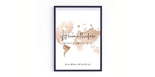 Yuweli personalisiertes poster familie mit namen & koordinaten | geschenk zum einzug, hausbau, richtfest oder umzug | individuelles wandbild für zuhause | din a4 oder din a3 mit rahmen
