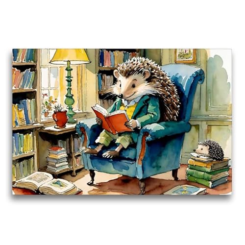 CALVENDO Premium Textil-Leinwand 75 x 50 cm Querformat Herr Igel liest ein Buch | Wandbild, HD-Bild auf Keilrahmen, Wanddekoration, Kunstdruck von Steffani Lehmann