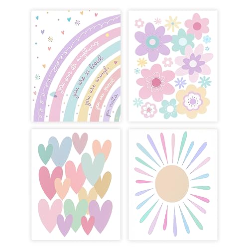 Komergave 4 Stück Rosa Regenbogen Blumen Poster Bilder Kinderzimmer Mädchen, Leinwand Druck Wandbilder mit Dream Big Spruch, Kinderzimmer Deko für Mädchen, Bilder Babyzimmer, Ohne Rahmen (20x25cm)