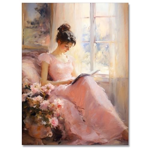 Huabsad Ölgemälde im Vintage-Porträt, Wandkunst, Retro, rosa Mädchen, das ein Buch liest, Poster, berühmte antike weibliche Leinwandbilder, Drucke, Wanddekoration, ästhetisch für Schlafzimmer,