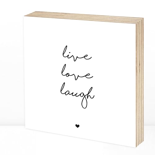 Wunderpixel® Holzbild live love laugh - 15x15x2cm Holzschild zum Hinstellen/Aufhängen, Fotodruck mit Spruch auf Holz - schwarz-weißes Wand-Bild Aufsteller zur Dekoration Geschenk - lebe liebe lache
