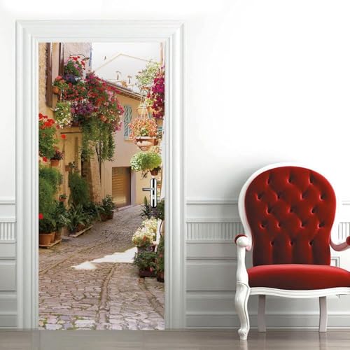 Türtapete Selbstklebend 85x200 cm Stadt Straße Türaufkleber 3D Blumenallee Türposter Türfolie Poster Tapete PVC Wasserfest für Schlafzimmer Wohnzimmer Tür A-927
