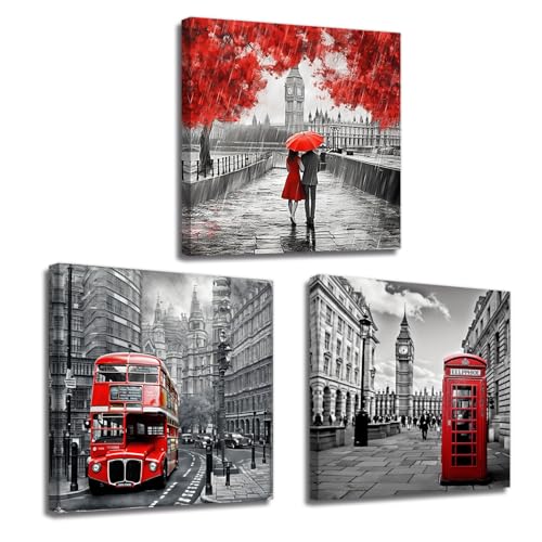 LZIMU Schwarz weißes und rotes Bild auf Leinwand romantisches Paar mit Regenschirm London Big Ben Berliner Straße Leinwandbild Jubiläum Wanddekoration Gerahmt(3, 25x25cmx3 Stück)