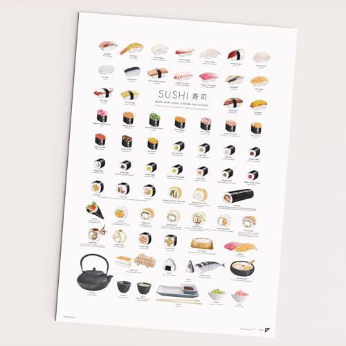 MJ-GRAPHICS - Poster Sushi - Bild mit Speisen Rezept & Zutaten - Wandbild Din A4 in Galerie Qualität mit extra dickem 300g Posterpapier - Retro Poster FineArt Kunstdruck ohne Bilderrahmen