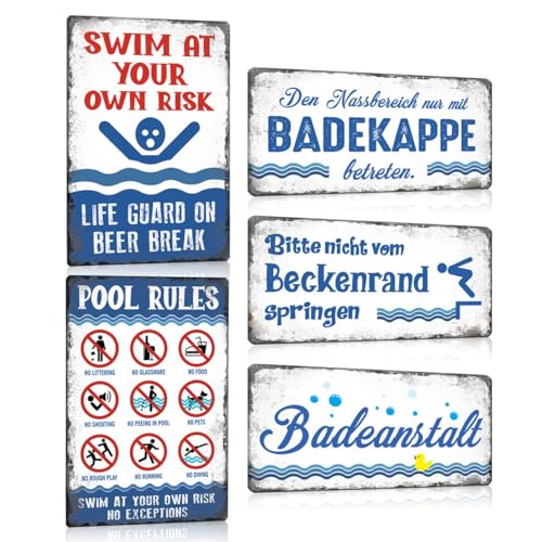 5er Set Blechschild Retro Pool mit Spruch Lustig | BADEANSTALT | SWIM AT YOUR OWN RISK | POOL RULES - Schwimmbad Sicherheitsschild Warnschild Wetterfest Schild Deko Zubehör für Pools Outdoor.